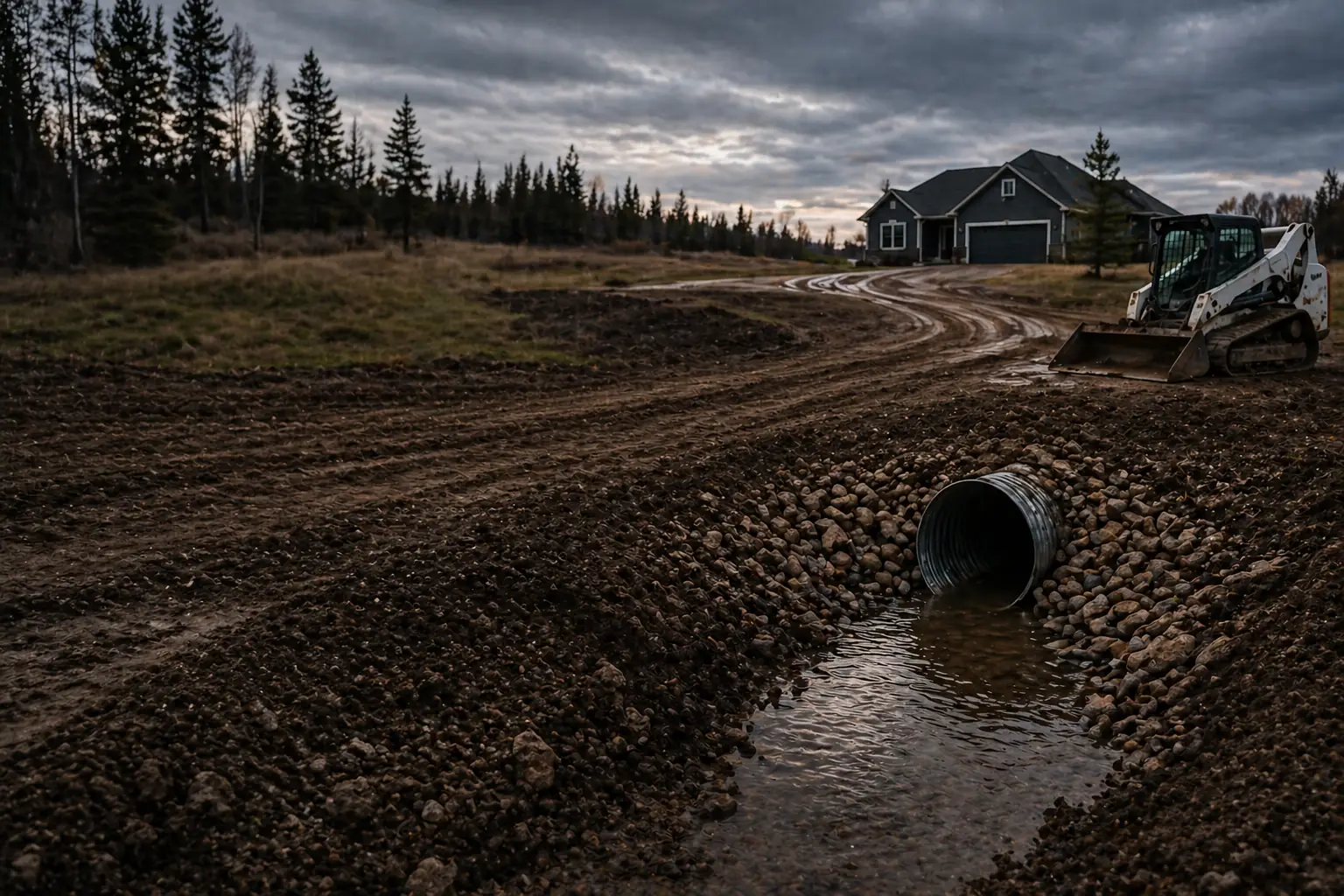 Prairie Acre Developments provides grading and drainage solutions for acreage properties across Parkland County, focused on long-term performance, proper planning, and clean execution (Planning & Design).